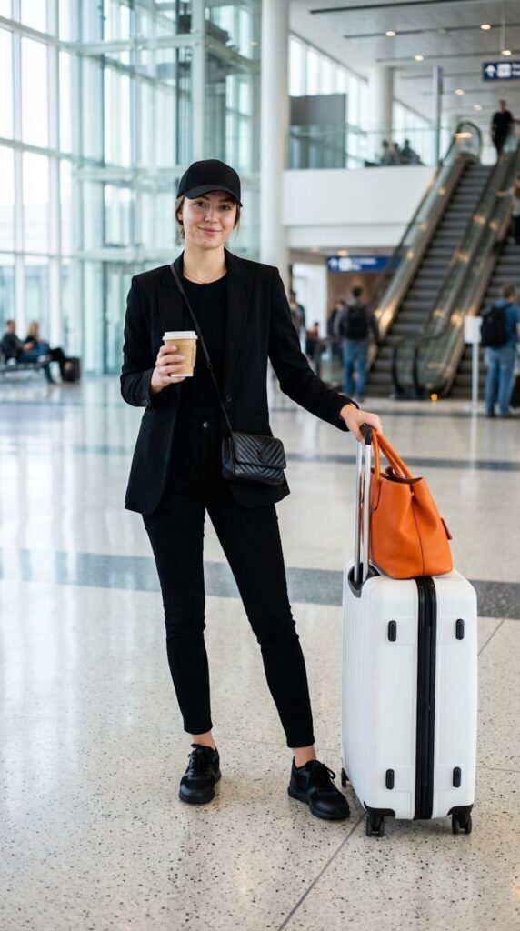 An all-black travel outfit is the perfect blend of sleek style and practicality for long flights. This timeless look is easy to style, hides wrinkles, and always looks polished.