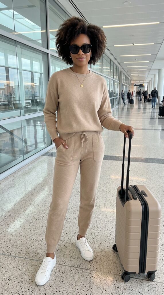 A soft knit set is the perfect cozy outfit for long flights, offering warmth and comfort without compromising style.