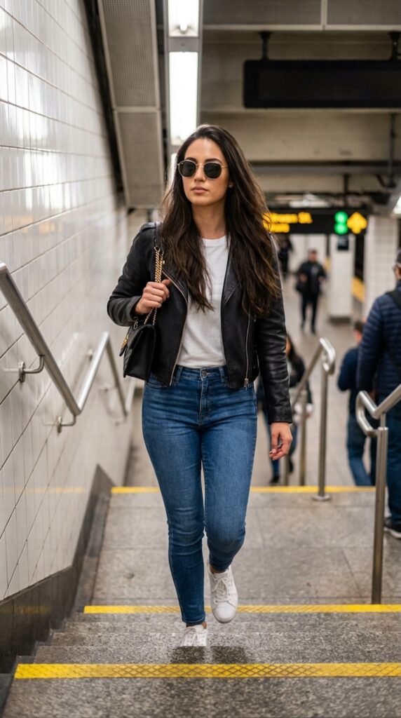 Add an edgy touch to your travel wardrobe with a leather jacket and jeans combo.