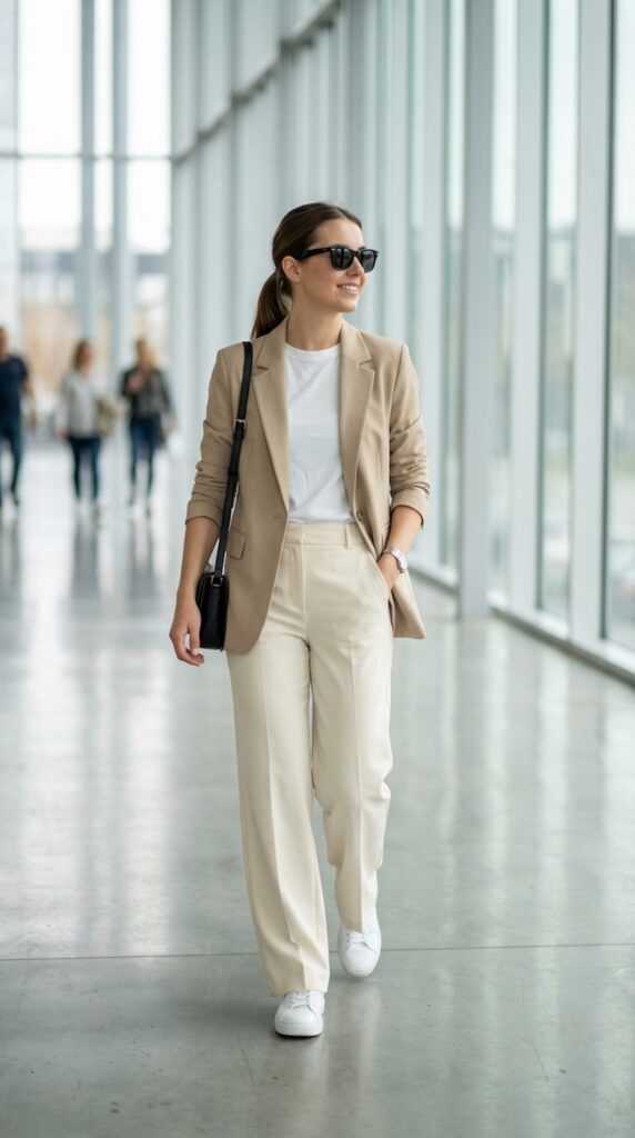 Elevate your travel style with a blazer and sneakers combination that blends comfort and sophistication.