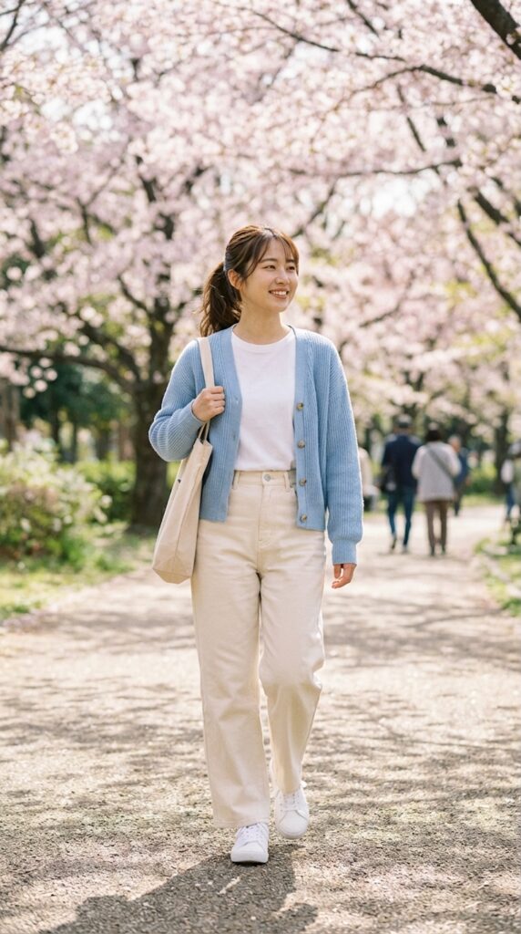It’s cozy, breathable, and perfect for layering in changing cabin temperatures. Paired with chunky sneakers and a tote bag, this look balances casual and trendy effortlessly.