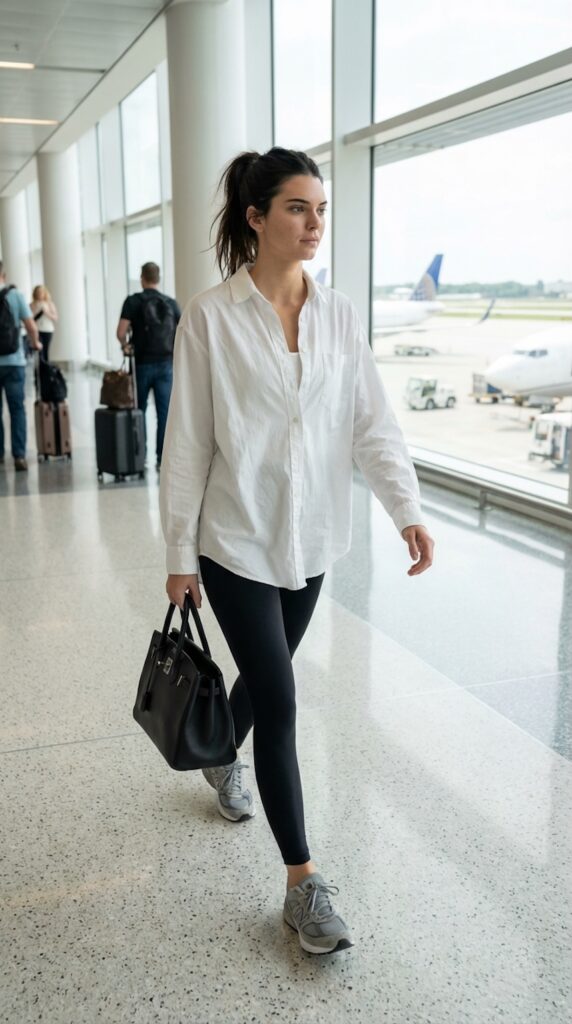 A leggings and oversized shirt combo is a simple yet stylish travel outfit perfect for long flights.