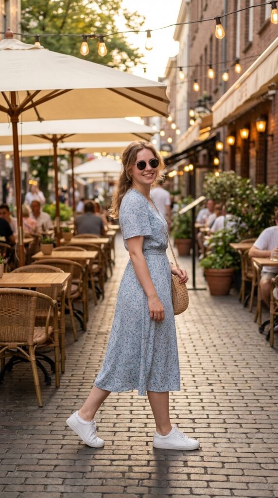 A maxi dress paired with sneakers is a perfect travel outfit for long flights, combining comfort with feminine style.
