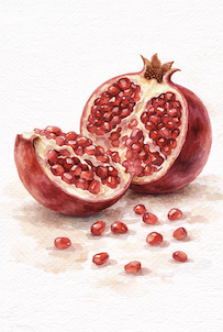 A split pomegranate with scattered ruby-red seeds and juicy texture.