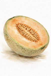 A cantaloupe or muskmelon cut open, showing seeds and soft orange flesh.