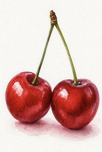 Two glossy cherries connected by a stem, painted with rich reds and reflections.