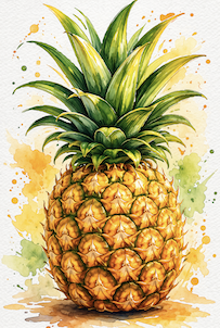 A textured pineapple with golden hues and spiky green leaves in loose brush style.