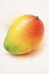 A ripe mango with a smooth gradient of yellow, orange, and hints of green.