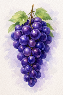 A hanging bunch of grapes with deep violet tones and soft highlights.