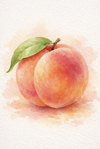 A fuzzy peach with warm pink and orange gradients, paired with a soft green leaf.