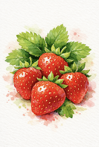 A small bunch of ripe red strawberries with green leaves, painted with juicy gradients and tiny seed details.