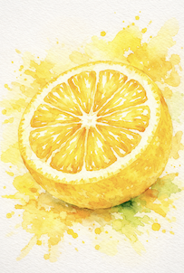 A bright lemon cut in half with visible segments, surrounded by soft watercolor splashes.