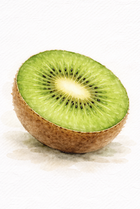 A sliced kiwi showing its radial pattern and tiny black seeds.