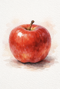 A shiny red apple with a subtle highlight and a soft shadow on textured paper.
