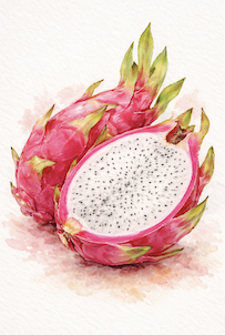 A vibrant dragon fruit with pink skin and speckled white interior.