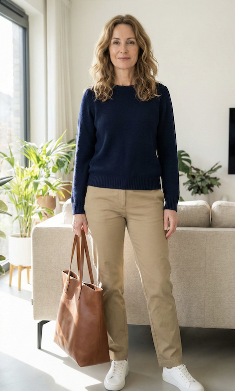 A navy knit sweater with khaki trousers achieves a smart, understated formal look that feels both comfortable and refined.