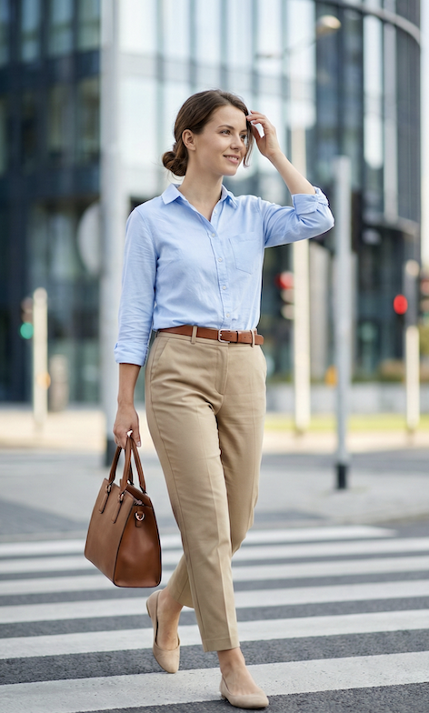A light blue button down paired with tailored beige trousers is a classic combo of office formality.