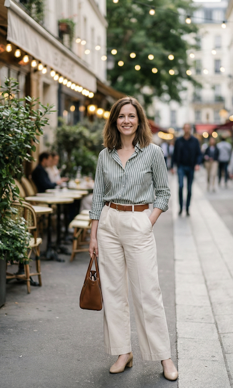 4. Striped Shirt with Wide-Leg Cream Trousers