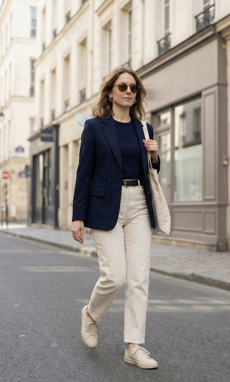 The sneakers keep the outfit youthful and modern while the blazer adds authority.