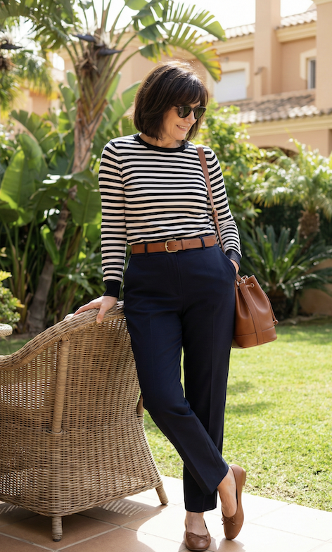 19. Black-and-White Striped Blouse with Navy Wide-Leg Pants