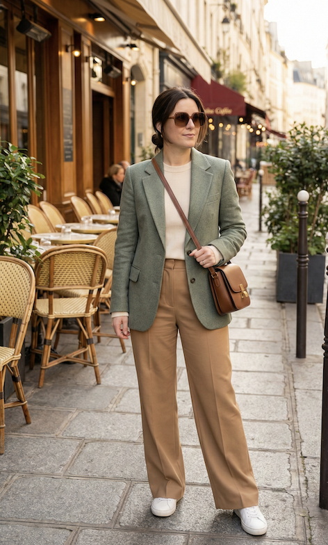 The white sneakers lend a light and modern touch, while the soft tone underlying the blazer is a great balancer.