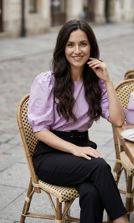 11. Lavender Puff-Sleeve Blouse with Black Tailored Pants