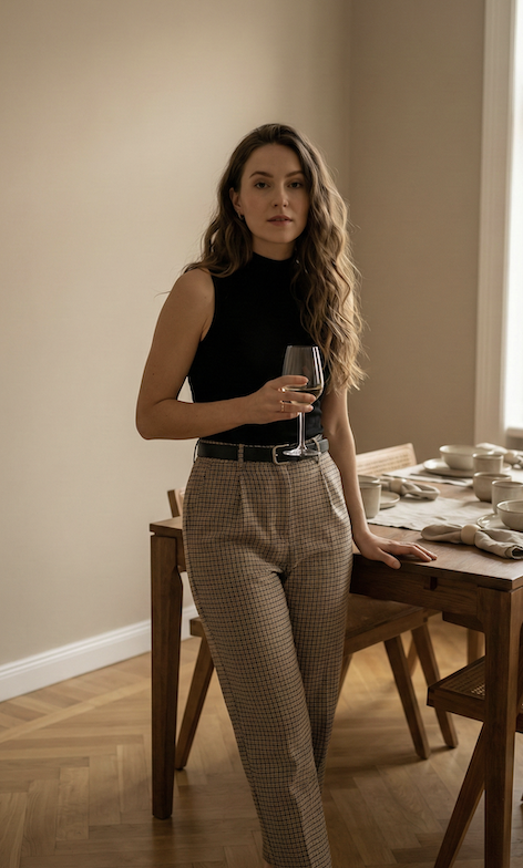 An outfit that combines a sleeveless black top and checked tailored trousers offers a contemporary look and a take on classic formal wear.