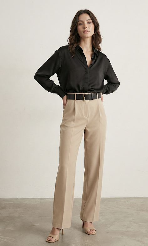 15. Black Button-Down Shirt with Beige Wide-Leg Pants