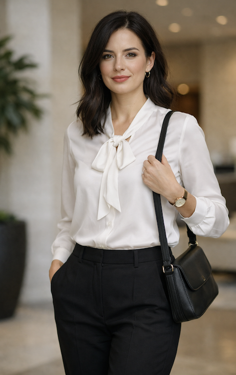 White Bow-tie Blouses with Black Formal Trousers are a great example of combining softness with a classic corporate look.