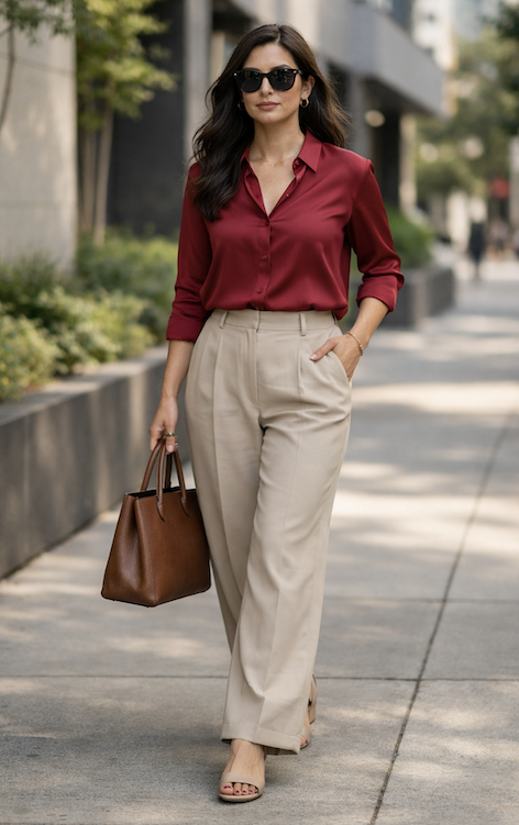 21. Burgundy Silk Shirt with Beige Wide-Leg Trousers