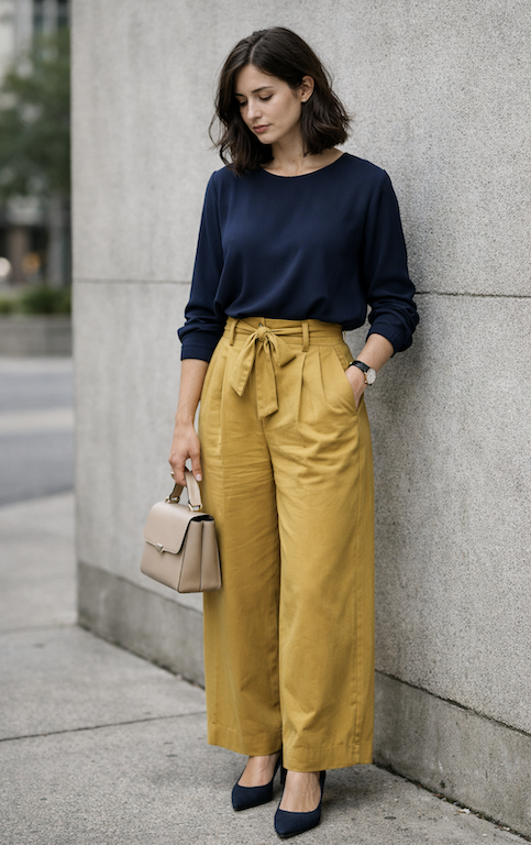 11. Mustard Wide-Leg Pants with a Navy Blouse