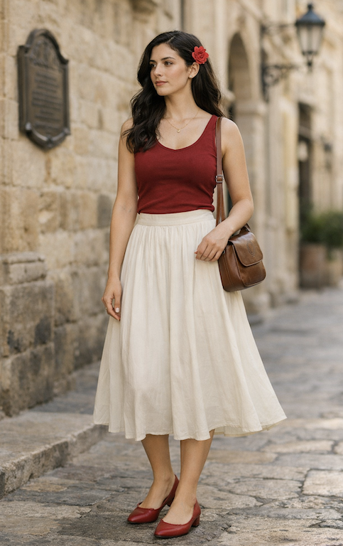 The combination of a red sleeveless top with a soft cream flowy midi skirt provides a warm, confident and balanced overall look.