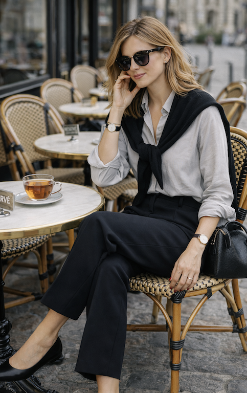 The classic Parisian look of a light buttoned down shirt with black tailored trousers is brought to the modern era