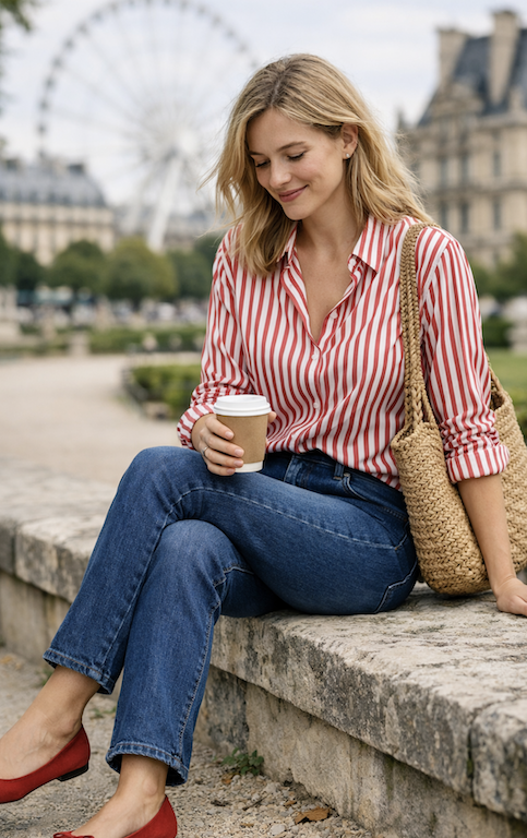 The red striped button-down shirt is fun and casual and pairs well with blue jeans. This outfit is simple and easy to put together while still looking fashionable.
