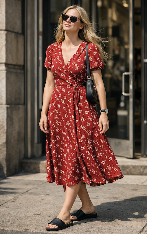 1. Red Floral Wrap Dress with Black Slides