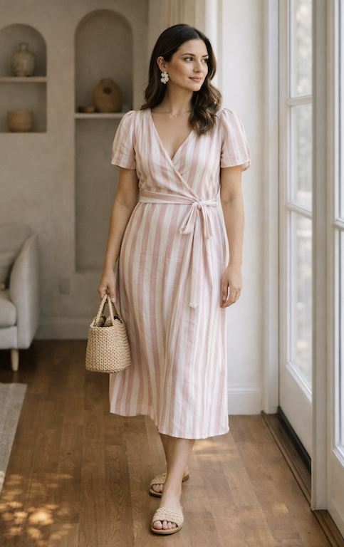 3. Blush Striped Wrap Dress with Woven Bag