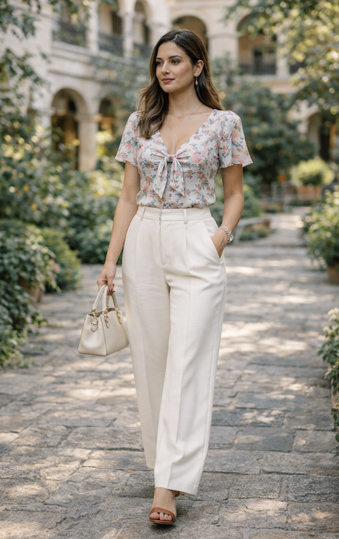 4. Floral Blouse with High-Waisted White Trousers