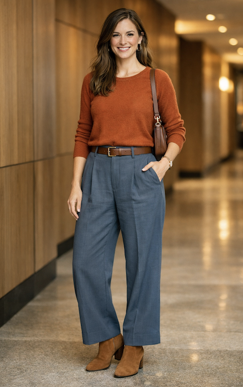 5. Rust Knit Top with Tailored Blue Trousers