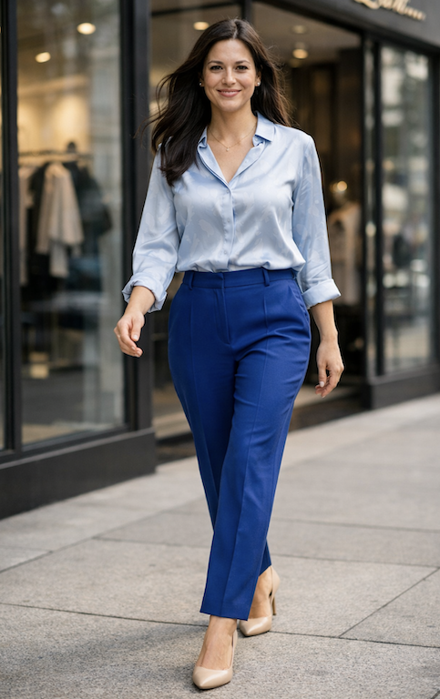6. Light Blue Blouse with Cobalt Tailored Pants