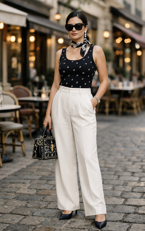 The Black Sleeveless Top and Cream Wide-Leg Trousers is a perfect combination for a chic daytime look.