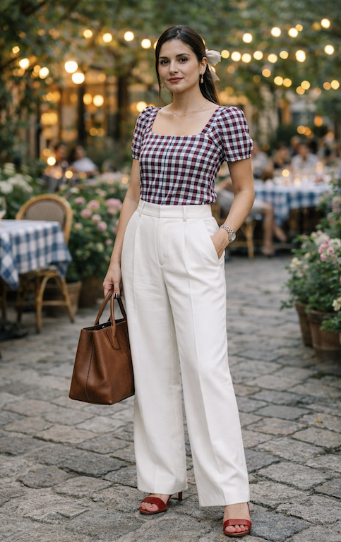9. Gingham Top with White Tailored Trousers