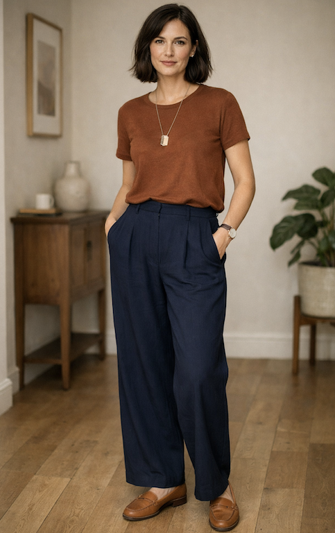 10. Brown Tee with Navy Wide-Leg Pants
